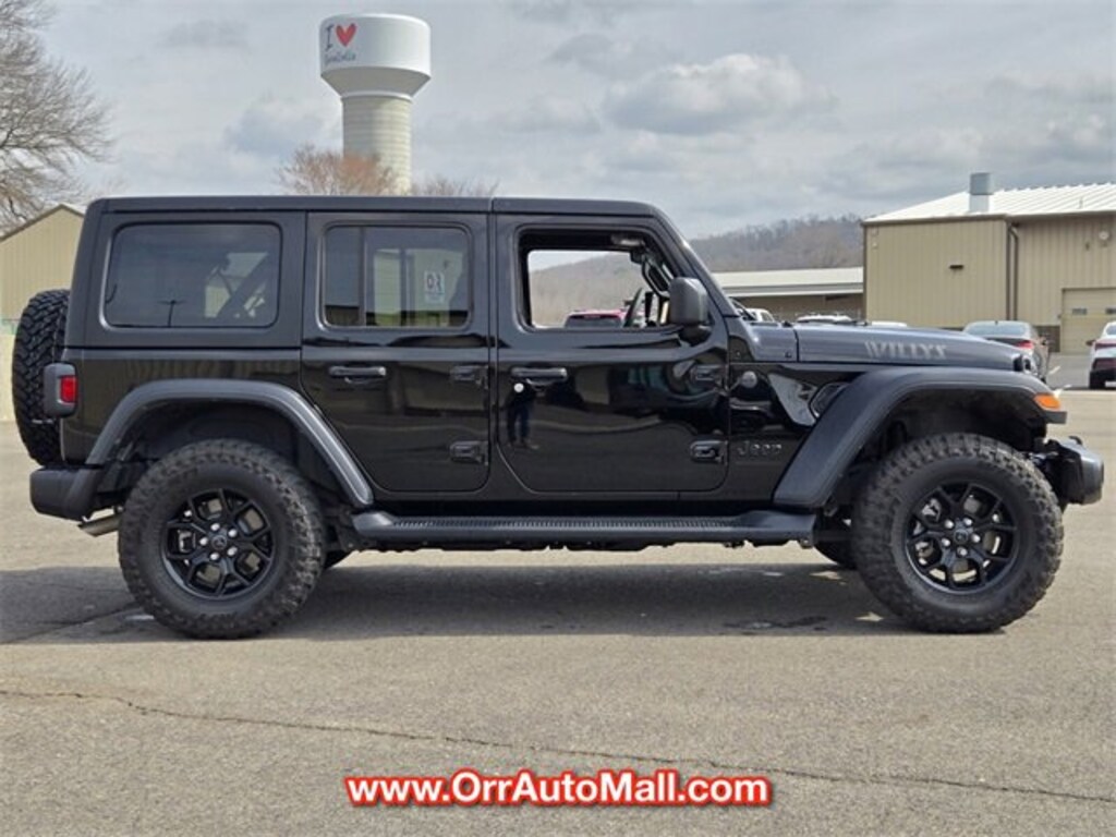 Quick Order Package 22W Willys (4-Wheel Drive Swing Gate Decal, 7 & 4 Pin Wiring Harness, 97 MPH Vehicle Max Speed Calibration, Advanced Brake Assist, Automatic Headlamps, Auxiliary Switches, Black Grille, Class II Receiver Hitch, Conventional Differential Front Axle, Corning Gorilla Glass, Dana M210 Wide HD Tube Front Axle, Dana M220 Wide Rear Axle, Daytime Running Lamps LED Accents, Deep Tint Sunscreen Windows, E-Locker Rear Axle, Enhanced Adaptive Cruise Control, Front LED Fog Lamps, Full Speed Forward Collision Warning Plus, Injection Molded Black Rear Bumper, LED Premium Reflector Headlamps, Mold In Color Bumper w/Gloss Black, Molded in Color Rubicon Highline Flare, MOPAR All-Weather Floor Mats, Off-Road Plus Mode, Power Heated Mirrors, Premium Wrapped Steering Wheel, Security Alarm, Sun Visors w/Illuminated Vanity Mirrors, Wheels: 17" x 7.5" Painted Black, Willy's Suspension, and Willys Hood Decal), Quick Order Package 23W Willys, 110 MPH Vehicle Max Speed Calibration, 4-Wheel Disc Brakes, 8 Speakers, ABS brakes, Air Conditioning, Apple CarPlay/Android Auto, Aux Battery, Black 3-Piece Hard Top, Brake assist, Cloth Low-Back Bucket Seats, Compass, Delay-off headlights, Driver door bin, Driver vanity mirror, Dual front impact airbags, Dual front side impact airbags, Electronic Stability Control, Freedom Panel Storage Bag, Front anti-roll bar, Front Bucket Seats, Front Center Armrest w/Storage, Front fog lights, Front reading lights, Illuminated entry, Integrated roll-over protection, Jeep Trail Rated Kit, Low tire pressure warning, Non-Lock Fuel Cap w/o Discriminator, Normal Duty Suspension, Occupant sensing airbag, Outside temperature display, Overhead airbag, Panic alarm, ParkView Rear Back-Up Camera, Passenger door bin, Passenger vanity mirror, Power steering, Power windows, Radio data system, Radio: Uconnect 5 w/12.3" Display, Rear anti-roll bar, Rear reading lights, Rear Window Defroster, Rear Window Wiper/Washer, Remote keyless entry, SiriusXM, Speed control, Split folding rear seat, Steering wheel mounted audio controls, Stop-Start Dual Battery System, Tachometer, Telescoping steering wheel, Tilt steering wheel, Traction control, Trip computer, Variably intermittent wipers, and Wheels: 17" x 7.5" Black Steel Styled.